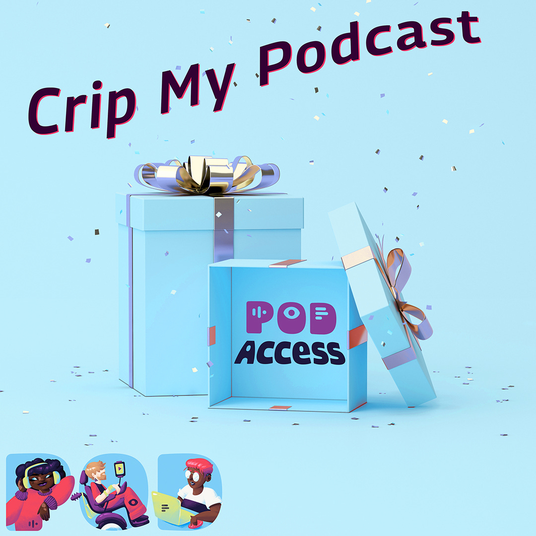 [Image description: Two sky blue gift boxes with gold and purple ribbons sit on a sky blue background with gold and purple confetti falling around them. One box is on its side, open, showing off the POD Access logo stamped on the inside. In wavy, dark purple letters, “Crip My Podcast” floats above the gift boxes like a banner. Below the boxes, the word POD is spelled out with a podcaster inside each letter. P is a Black person listening on headphones. Three lines representing sound waves are on their rosy red sweater. O is a white person with scruffy blond beard and a rosy red outfit with an eye representing the visual on the pants leg. He’s watching a podcast on his wheelchair mounted device. P is a brown-skinned person with glasses and a hearing aid, reading on their honeydew green laptop. Three lines representing writing are stamped on the laptop’s lid.]